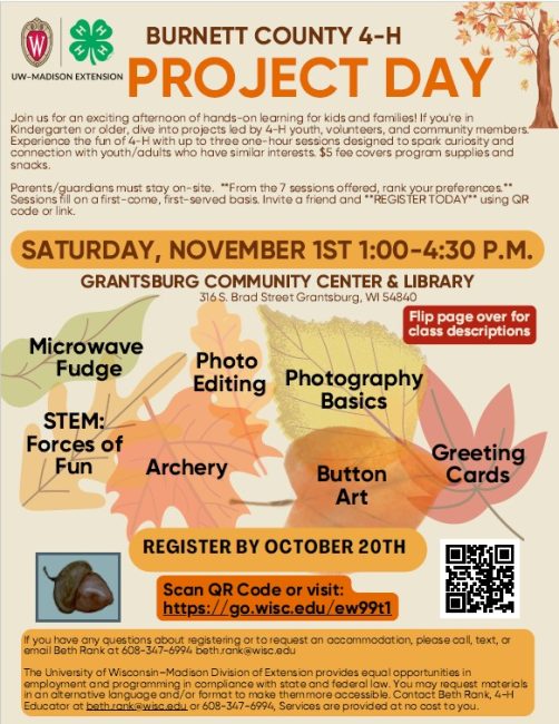 4-H Youth in grades 3-13 (one-year post-HS graduation) are able to choose the projects they are involved in. Not all project areas have project volunteers in Burnett County. But many do. Please explore the Projects page for county-specific project groups. Additional information is posted in newsletters, via email, and on the event calendar.