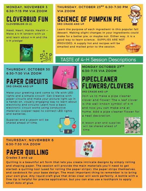 Come “sample” the different projects 4-H has to offer. Some Supplies will be provided and can be picked up at your local Extension Office. A list of additional supplies will be provided prior to session.